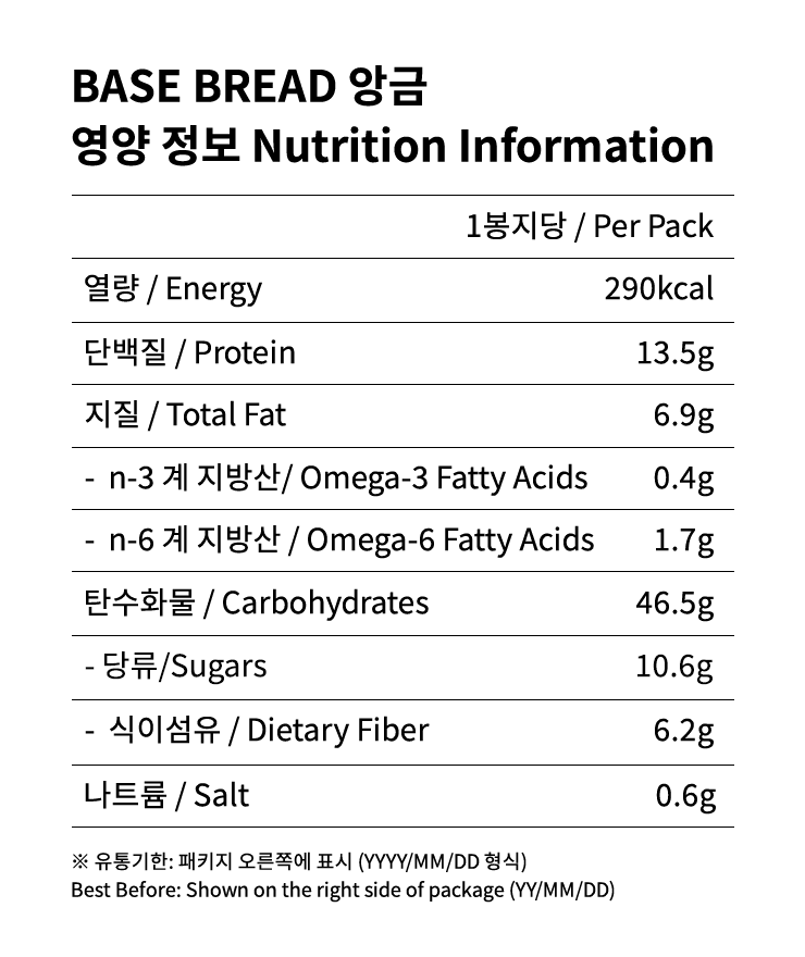 ※1 1식 중(BREAD 2봉지), 그 기준은 일본 농림수산성에서 정한 영양소 등의 기준치에 따른 것으로, 지방/포화지방산/탄수화물/나트륨을 제외한 모든 영양소의 함량은 최소 일일 기준치의 1/3 이상입니다.