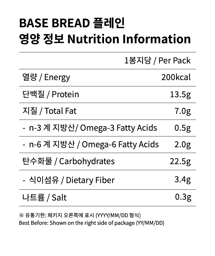 BASE FOOD는 약 30g의 단백질, 풍부한 식이섬유, 26가지 종류의 비타민과 미네랄 등 하루 신체에 필요한 영양소를 공급하는 영양 주식입니다. ※1