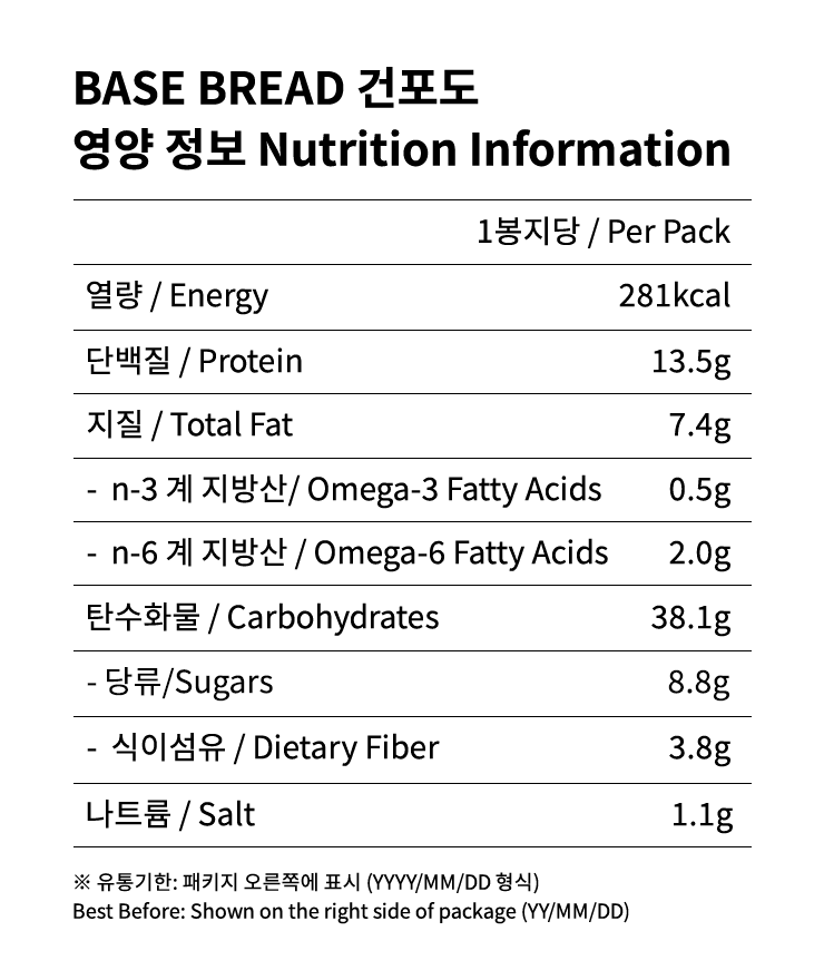 BASE FOOD는 약 30g의 단백질, 풍부한 식이섬유, 26가지 종류의 비타민과 미네랄 등 하루 신체에 필요한 영양소를 공급하는 영양 주식입니다. ※1